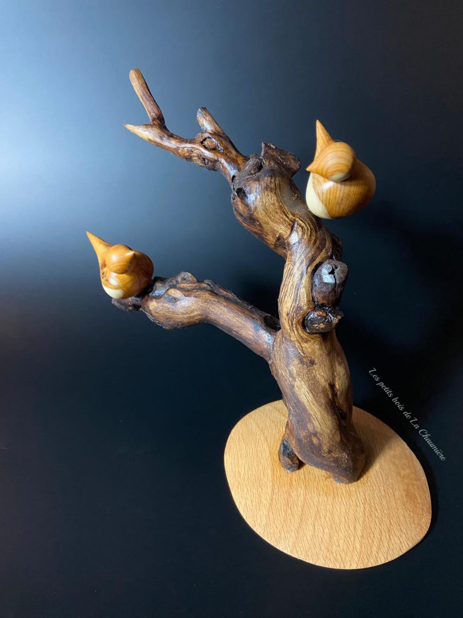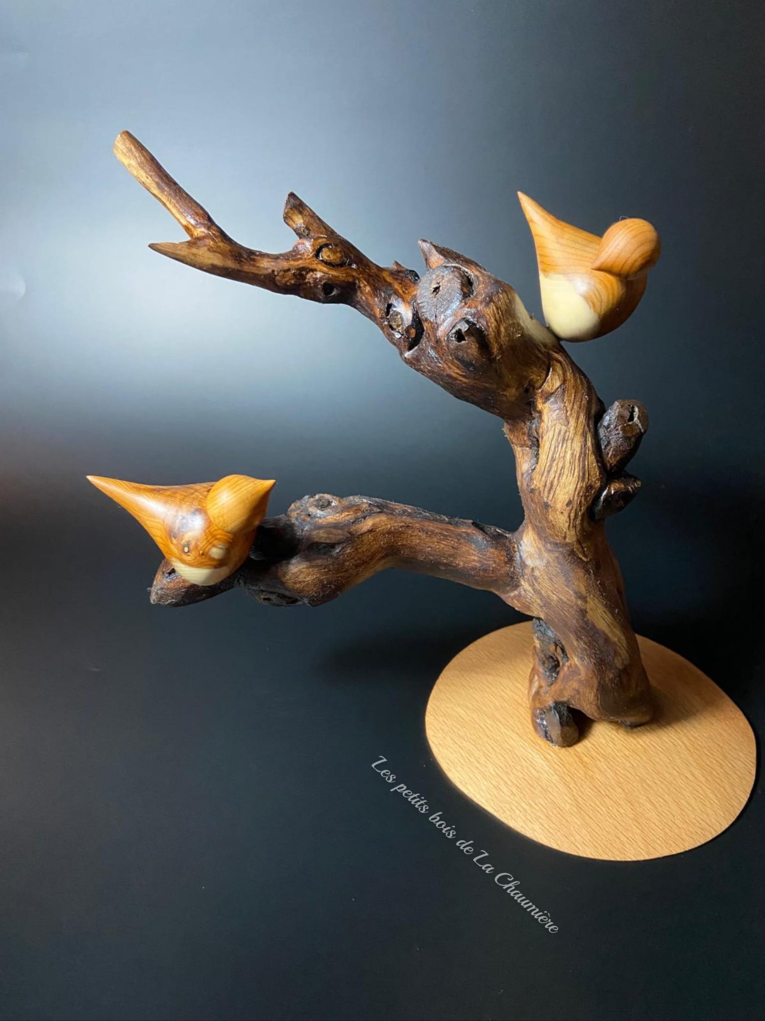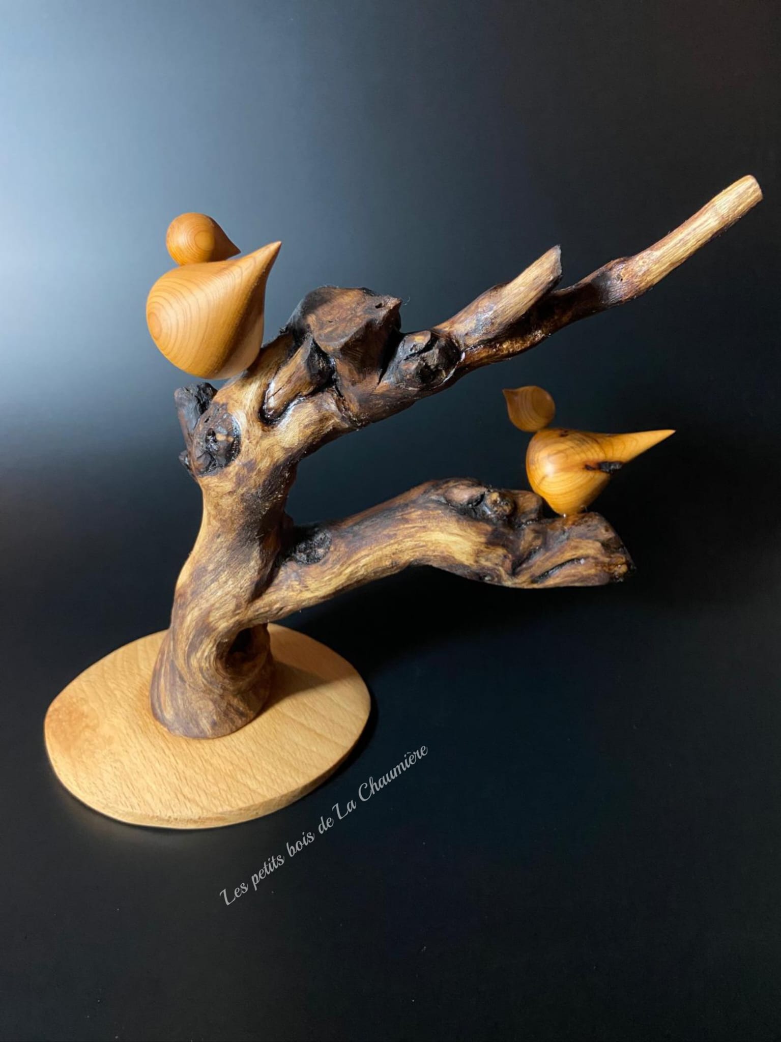 Deux oiseaux tournés à la main dans du bois d’If, aux formes douces et épurées, se font face sur un Cep de Vigne naturel, choisi pour ses courbes expressives et son caractère brut.